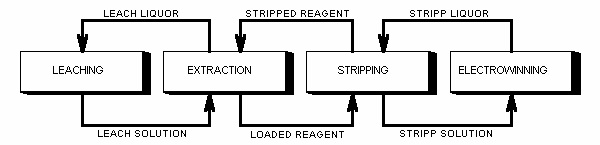 Den oxidiska koppparmalmen krossas och koppar lakas ut med hjälp av svavelsyra. Den resulterande laklösningen innehåller 2-5 g/l koppar, men också andra förorenande metaller. Nästa steg blir därför att extrahera kopparen ur laklösningen selektivt till en fotogenlösning, som innehåller ett kopparselektivt reagens. Kopparen, som överförts till den organiska lösningen, återextraheras (strippas) därefter till en ny vattenlösning på ett sådant sätt att kopparkoncentration i den ”nya” vattenlösningen blir 30-35 g/l. Slutligen utvinnes ren koppar ur striplösningen genom elektrolys.